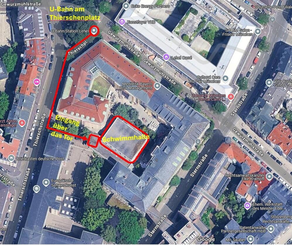 Ab sofort findet ihr unsere Schwimmhalle mitten im Zentrum von München, im Lehel, nur wenige Schritte von der U-Bahn-Haltestelle Lehel (U4/U5) entfernt.